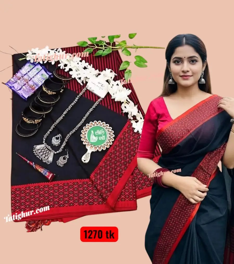 Black হাফসিল্ক (পাতলা) শাড়ি💝লাল-কালো প্রিমিয়াম গিফট প্যাকেজ